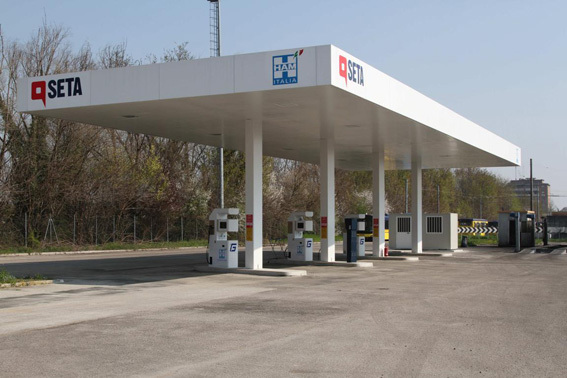 20~25MPで圧縮し体積が約1/200 ~1/250になった天然ガスがCNG(圧縮天然ガス)です。主に小型車や乗用車・バス等の天然ガス自動車に多く使われています。日本でもっともポピュラーな天然ガスステーションです。