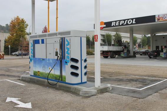 20~25MPで圧縮し体積が約1/200 ~1/250になった天然ガスがCNG(圧縮天然ガス)です。主に小型車や乗用車・バス等の天然ガス自動車に多く使われています。日本でもっともポピュラーな天然ガスステーションです。